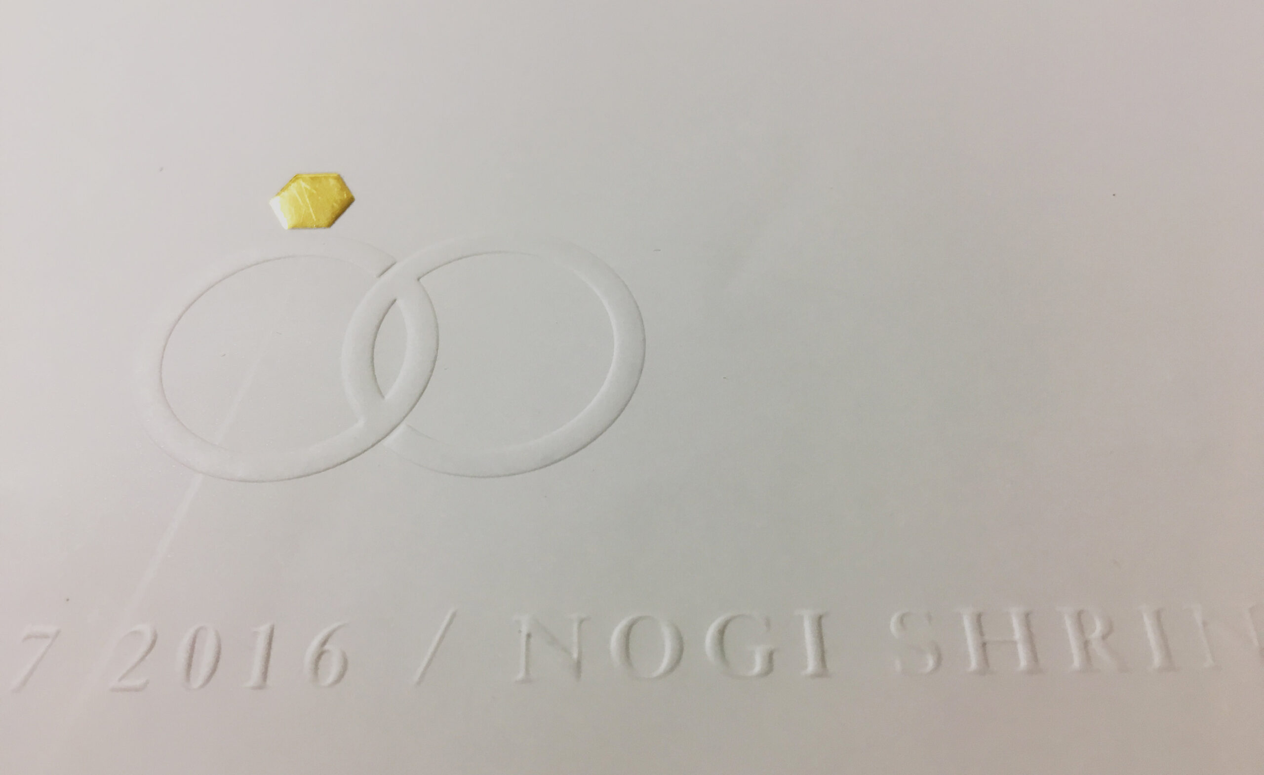 用紙の表面に凹凸をつけて、絵柄の一部を浮き出させる加工。雄雌の型を使って、紙に圧力をかけることで用紙を押し上げます。会社のロゴマークなどシンプルなデザインを浮き出させる事で、印刷では表現できない高級感を演出します。
